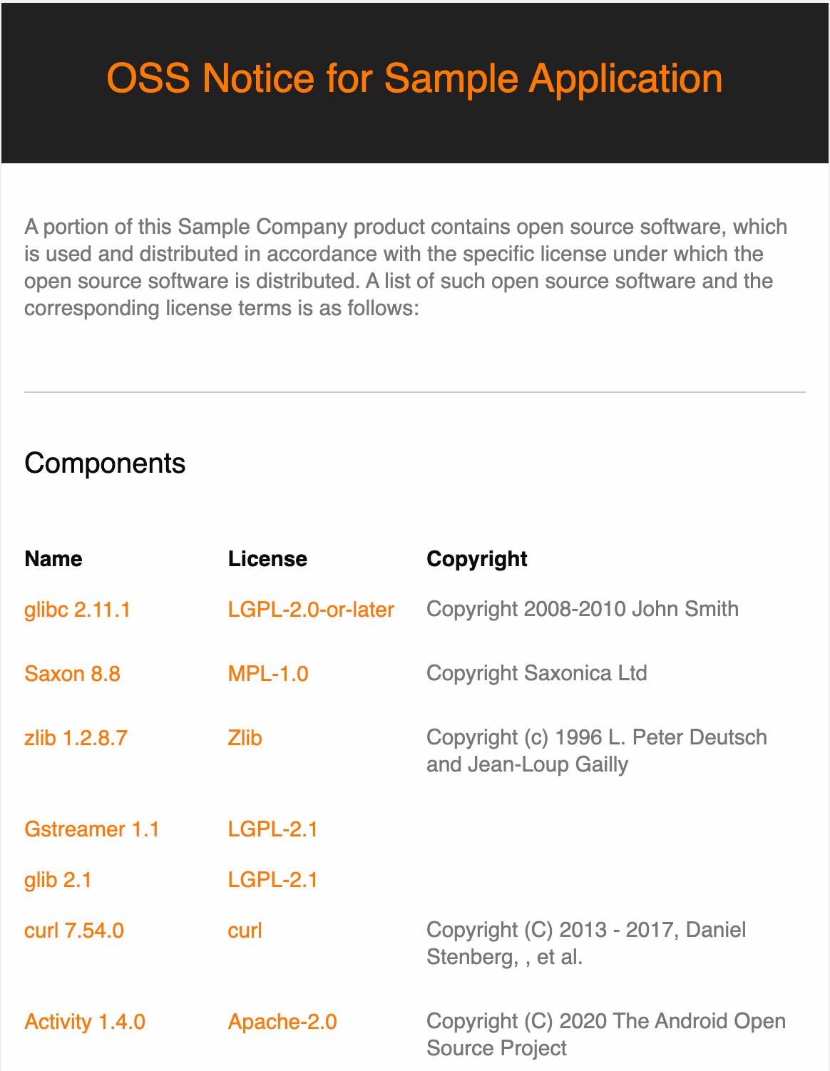 ‘고지’ 이다. GPL과 같이 소스 코드 공개를 요구하는 라이선스도 소스 코드를 제품과 함께 배포하는 대신‘Written Offer (서면 약정서)’를 오픈소스 고지문에 포함하여 제공한다. 따라서 기업은 오픈소스 라이선스가 요구하는 바를 파악해 이를 포함한‘오픈소스 고지문’을 생성하여 제공하는 것이 중요하다. 대부분의 오픈소스 라이선스는 바이너리 형태로 오픈소스를 배포 시 저작권 정보와 라이선스