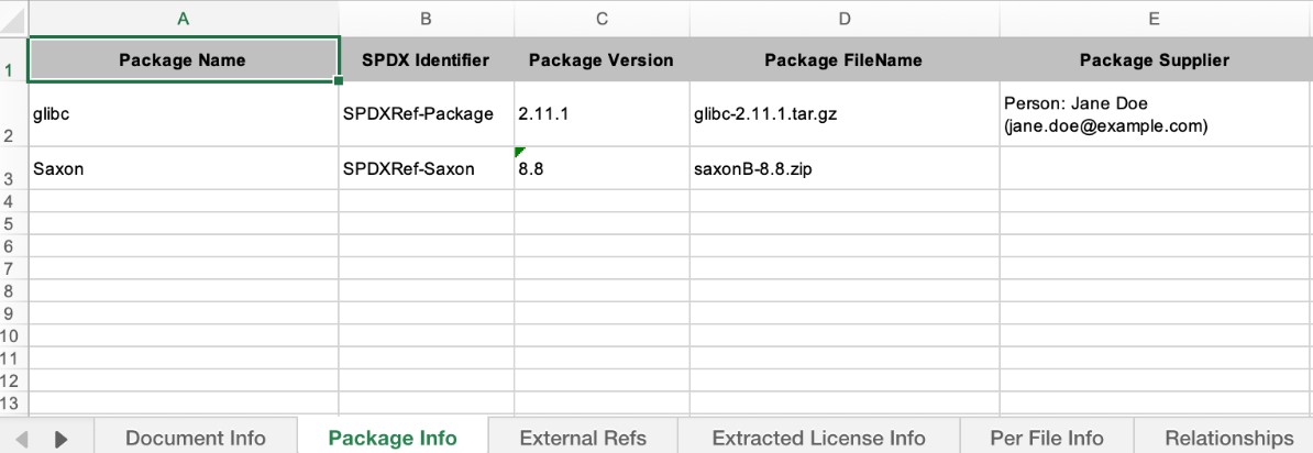 onot을 사용하기 위해서는 먼저SPDX에서 제공하는Excel 형태의 문서 내에 패키지, 버전,
